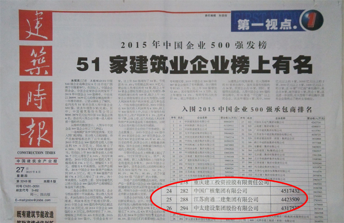 建筑時報8月27日報道了中太建設集團入圍2015年中國企業(yè)500強,在入圍的建筑承包商中排名第26位