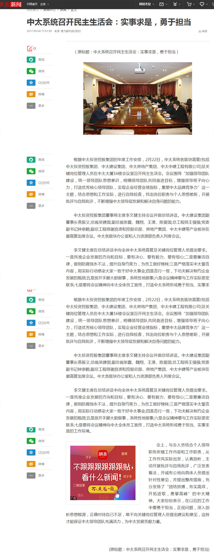 網(wǎng)易新聞報(bào)道了“中太系統(tǒng)召開(kāi)民主生活會(huì):實(shí)事求是,勇于擔(dān)當(dāng)”