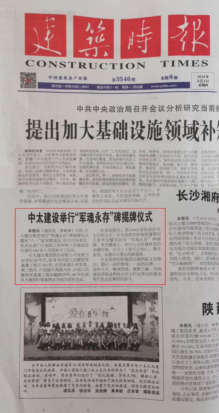 建筑時(shí)報(bào)8月2日報(bào)道了“中太建設(shè)集團(tuán)“軍魂永存”碑揭牌儀式”