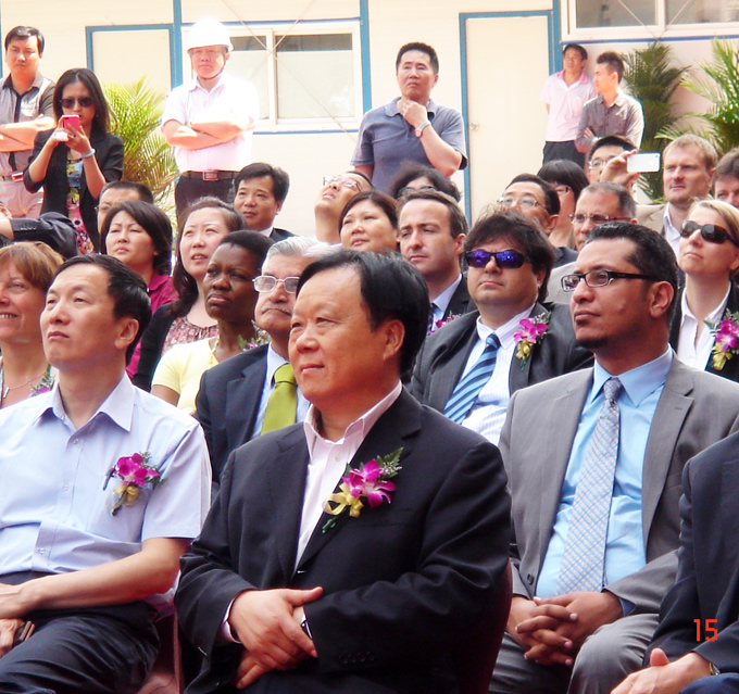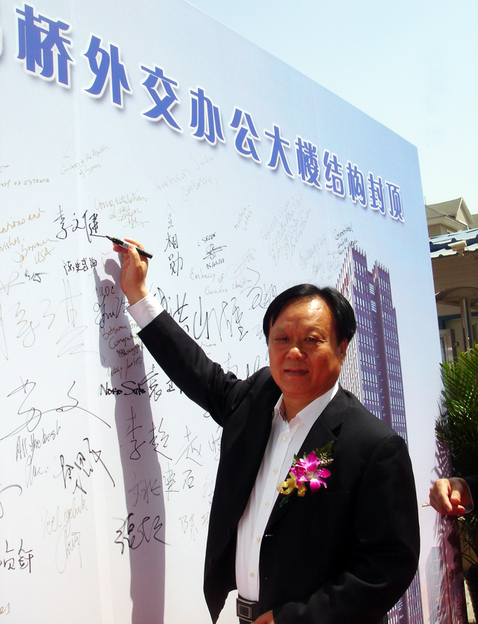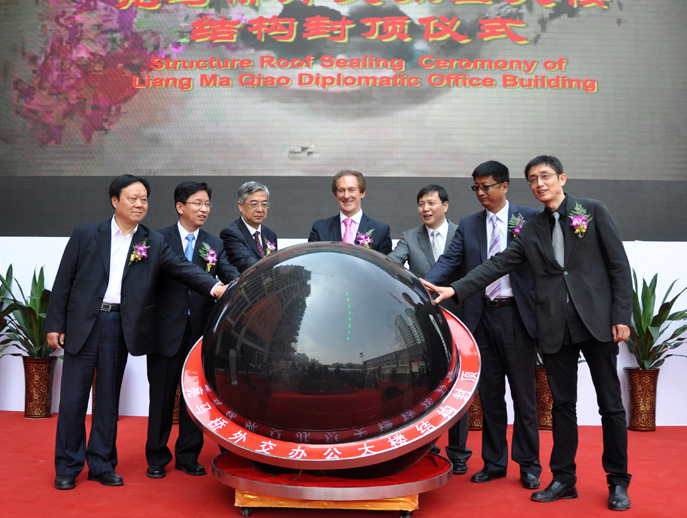 2013年5月15日上午,伴隨著最后一方混凝土的成功澆注,在50余名駐華外交使節(jié)以及外交部、北京市等有關(guān)部門(mén)代表的見(jiàn)證下,由集團(tuán)公司第八工程局承建的亮馬橋外交辦公大樓工程正式實(shí)現(xiàn)主體結(jié)構(gòu)封頂。董事局主席李文。ㄗ笠唬⿷(yīng)邀出席儀式。