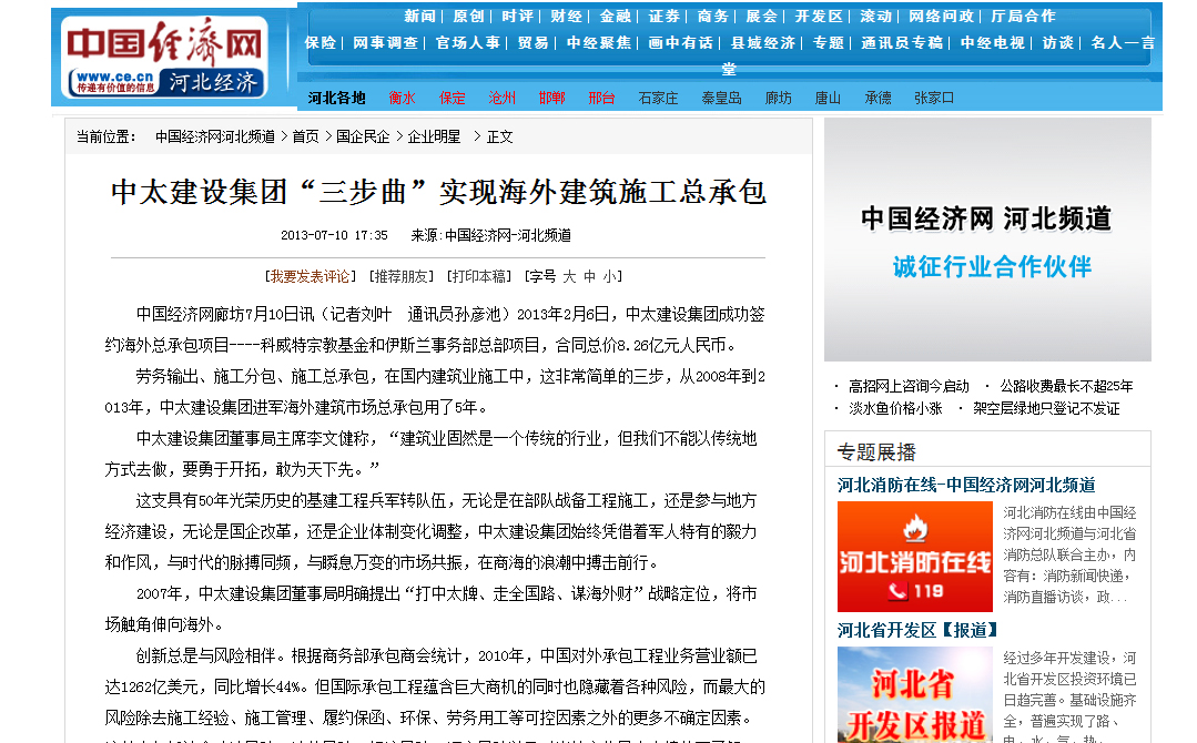 中國經(jīng)濟(jì)網(wǎng)報(bào)道了中太建設(shè)集團(tuán)“三步曲”實(shí)現(xiàn)海外建筑施工總承包