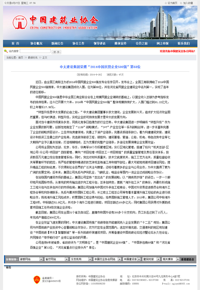 中國(guó)建筑業(yè)協(xié)會(huì)報(bào)道了中太建設(shè)集團(tuán)榮膺“2014中國(guó)民營(yíng)企業(yè)500強(qiáng)”第68位
