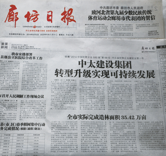 9月5日廊坊日報報道了中太建設(shè)集團(tuán)轉(zhuǎn)型升級實現(xiàn)可持續(xù)發(fā)展