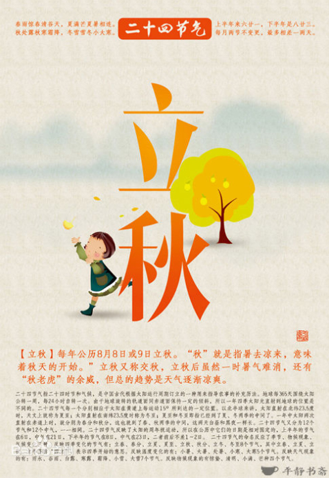 今天是立秋,意味著夏季的結(jié)束,秋季的開始,氣溫逐漸下降,雨水逐漸減少。我國幅員遼闊,就節(jié)氣而言不可能同時(shí)進(jìn)入涼爽的秋季的,是有一些差別的。生活在廊坊這個(gè)地方,四季分明的氣候,是老天恩賜的福分。不冷不熱的天,氣候宜人,真正是秋高氣爽。我國古代將秋季劃分為三候:一候涼風(fēng)至,二候白露生,三候寒蟬鳴。是說立秋后刮風(fēng)人們會(huì)感到?jīng)鏊,大地早晨?huì)有霧氣產(chǎn)生,并且秋天感陰而鳴的寒蟬也開始鳴叫。民間流行“貼秋膘”,就是在立秋這天吃些美味佳肴,老百姓家就是燉肉、包餃子。