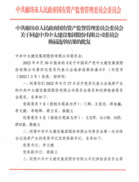 [2022] 3號關(guān)于轉(zhuǎn)發(fā)《中共廊坊市國有資產(chǎn)監(jiān)督管理委員會委員會關(guān)于同意中共中太建設(shè)集團股份有限公司